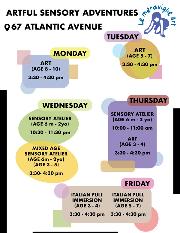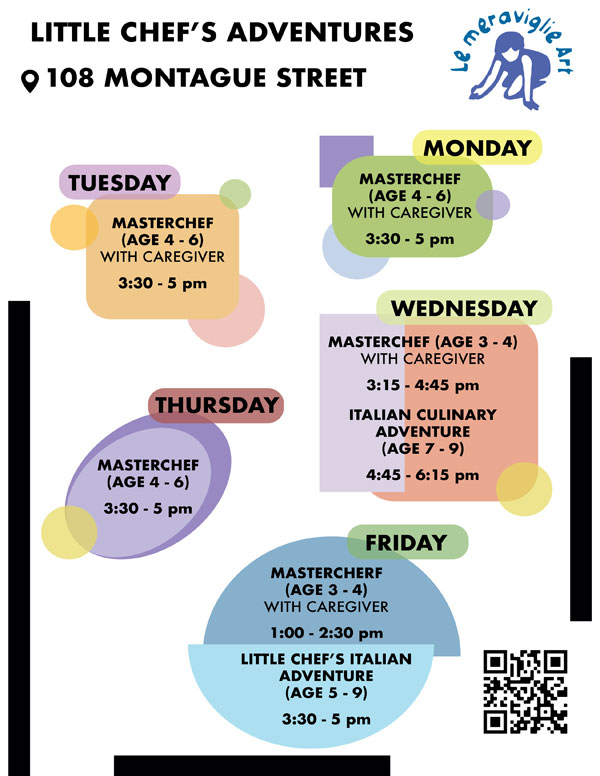 Founded by Italian artist and educator Piera Bonerba, Le Meraviglie – ‘the Wonders’ – provides innovative arts-enrichment programming for children at two prime locations in Brooklyn Heights. Our cooking classes are held on Montague Street, while our inspiring art classes take place on Atlantic Avenue, offering a vibrant blend of creativity and culinary exploration.
